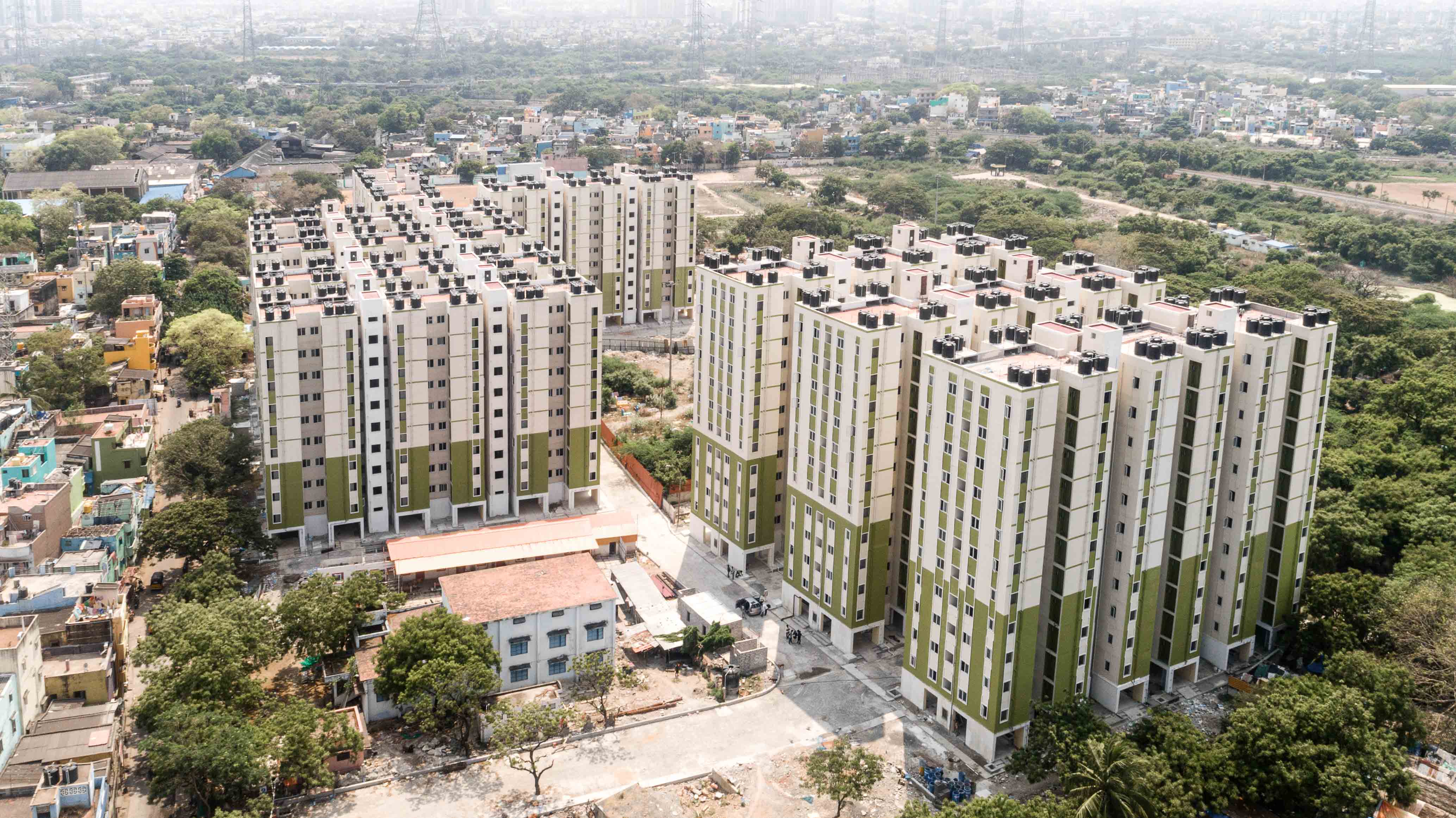 Hawk-eye view of the upcoming social housing project in the Vyasarpadi neighbourhood illustrating over a thousand TNUHDB flats in nine majestic high-rise towers beaming the North Chennai skyline.